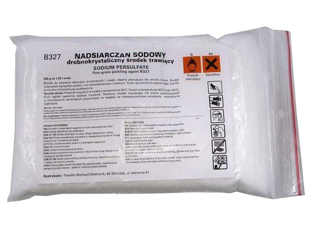 Sredstvo za nagrizanje štampanih ploča i bakra. Idealna je zamjena za FERIKLORID. Pakiranje sadrži 250gr. Sodium Sulphate [Na2S2O8] u prahu. Sadržaj se rastopi u 1,25l vode zagrijane na temperaturu 50°C (ne upotrebljavati metalno posuđe!). Potrebna temeratura za postupak nagrizanja je 40°C (50°C max.). Za vrijeme nagrizanja je potrebno otopinu lagano miješati za postizanje bržeg i jednakomjernijeg nagrizanja ! Otopina poprimi plavu boju kada je zasićena. !!VAŽNO!! > Vrećicu držite zatvorenom (ALI NE U HERMETIČKOJ POSUDI !!!) i dalje od dosega djece !! U slučaju dodira sa kožom ili očima isprati mjesto sa puno vode, odmah posjetiti liječnika \r\ni sa sobom ponijeti ambalažu u kojoj je bilo sredstvo za nagrizanje. Koristiti zaštitne rukavice i zaštitnu masku!
