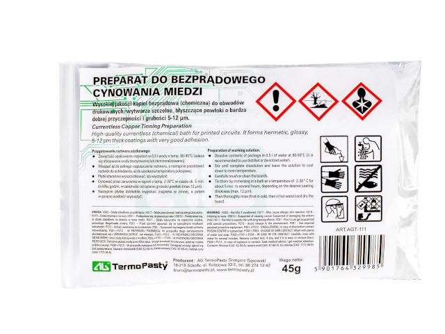 Visokokvalitetna (kemijska) kupka za tiskane pločice. Stvara hermetičke, sjajne premaze debljine 5-12 µm s vrlo dobrim prijanjanjem. Sredstvo pruža zaštitu od štetnog djelovanja zraka i vlage.