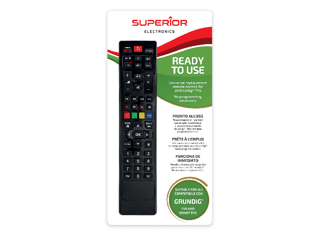 Univerzalni daljinski upravljač sa več predefiniranim kodovima za sve TV i SMART prijemnike Grundig proizvedene od 2000-te godine, dvostruki IR prijenos čini ovaj daljinski upravljač odmah funkcionalnim. Napajanje2 x AAA baterije (nisu uključene)