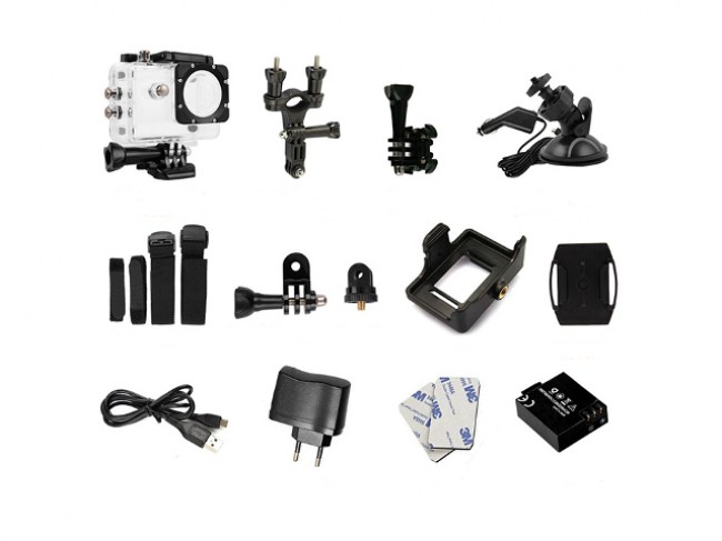 Sadržaj pakiranjasportska kamera, vodootporno kućište, držač za bicikl/motor, držač za kacigu, držač za vjetrobransko staklo, punjač za automobil, USB kabel