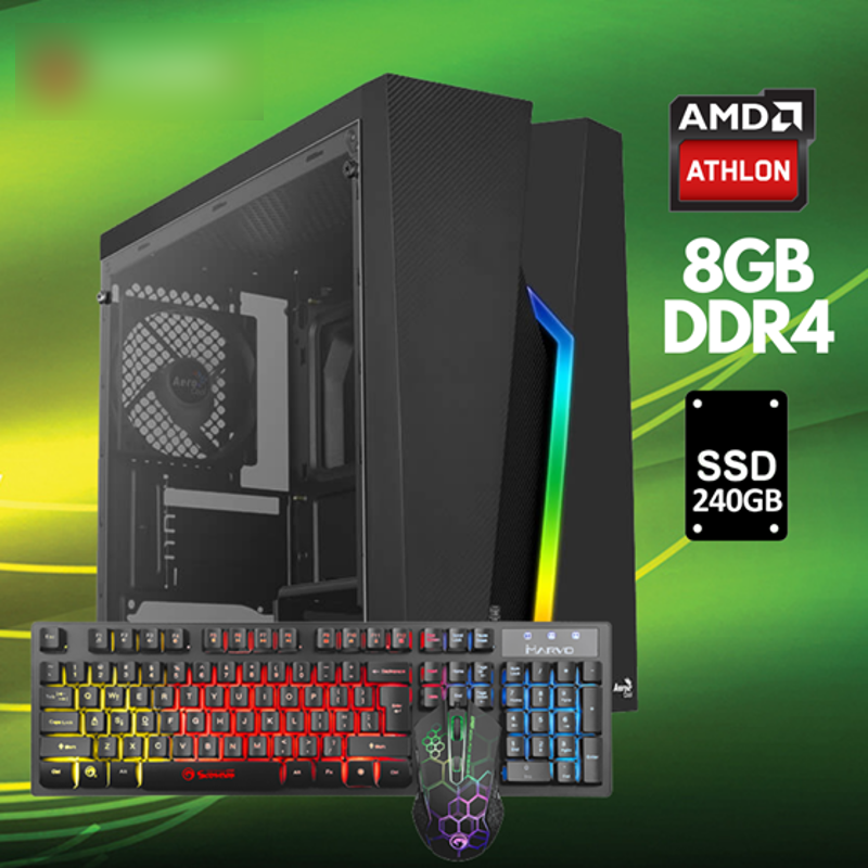 • Procesor AMD Athlon 3000G 3.5 GHz, 2C/4T\r\n• Matična ploča socket AM4 AMD A320M\r\n• Memorija PC DDR4 8GB 3000 Mhz\r\n• SSD 240 GB\r\n• Napajanje 500W\r\n• Kućište AEROCOOL Bolt Mini\r\n• Set MARVO SCORPION KM409 tipkovnica + miš, LED, UK/HR layout, crna