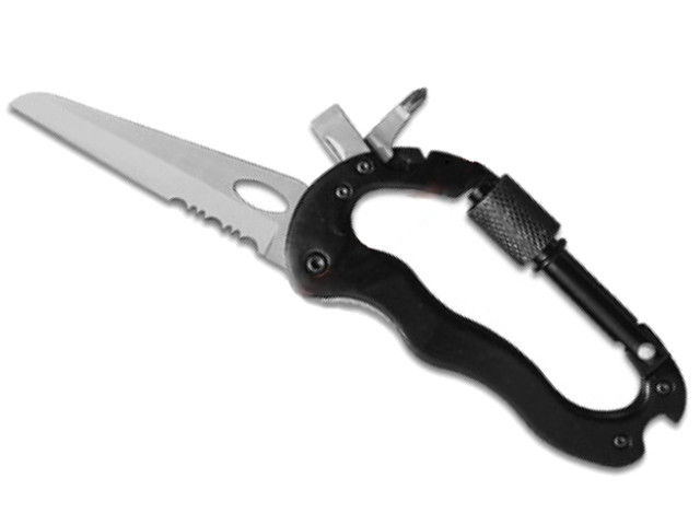 materijal: nehrđajući čelik, crna karabiner drška s praktičnim nastavcima ukupna dužina: 185 mm, 106 mm sklopljen, oštrica 75 mm, djelomično nazubljena