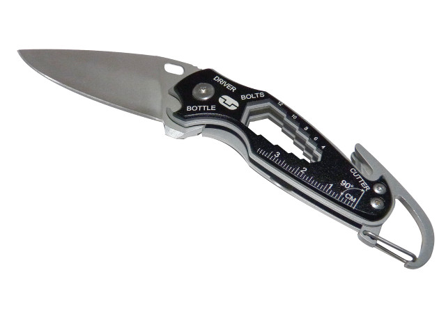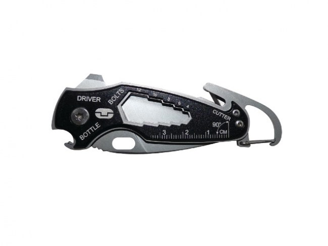 Privjesak sadrži: nož sa 55mm oštricom, držač za remen, otvarač boca, odvijač, ravnalo, planinarska kopčaDimenzija: 90 x 33mm