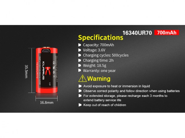 Baterija litij-ion 16340 3,6V 700mAh Klarus USB