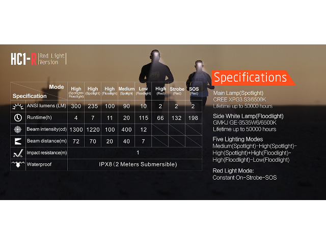 High(spot+flood) 300lm/4h, High(spot) 235lm/7h, High(flood) 100lm/11h, Medium 90lm/20h, Low 10lm/115h