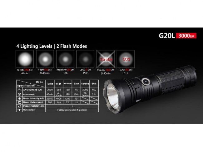 Turbo 3000lm/45min, High 650lm/4,5h, Medium 160lm/19h, Low 15lm/150h