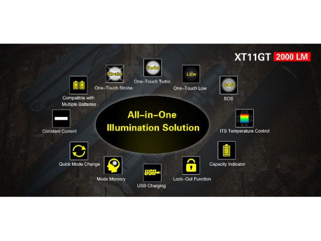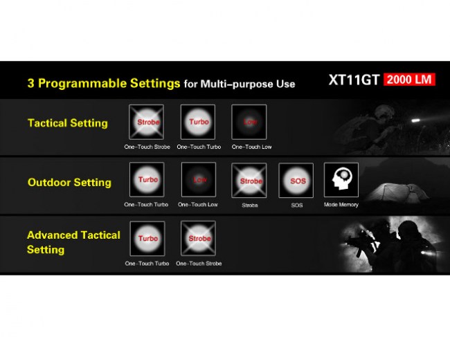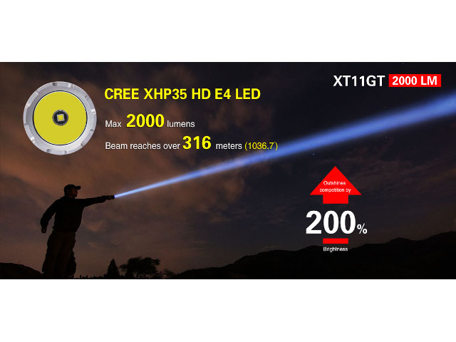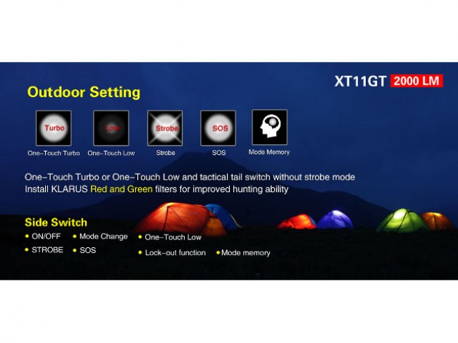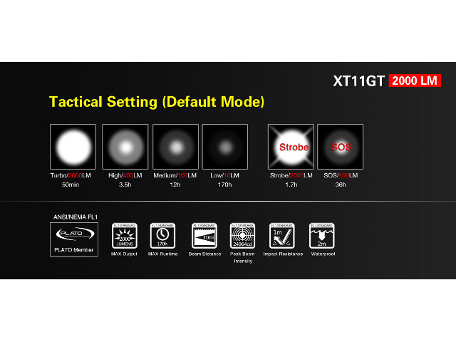 | Turbo 2000lm/50min, High 400lm/3,5h, Medium 100lm/12h, Low 10lm/170h | |