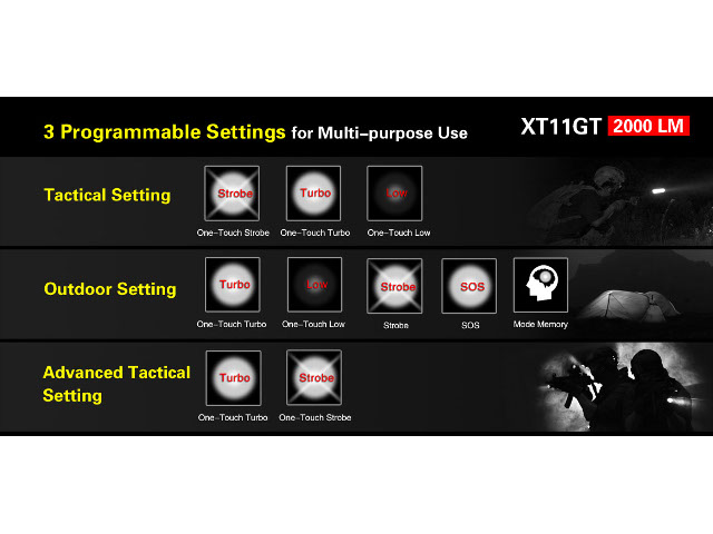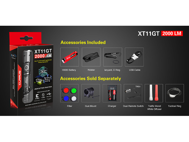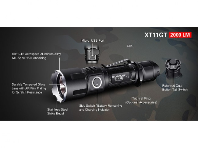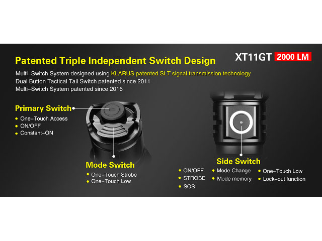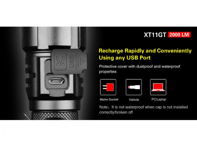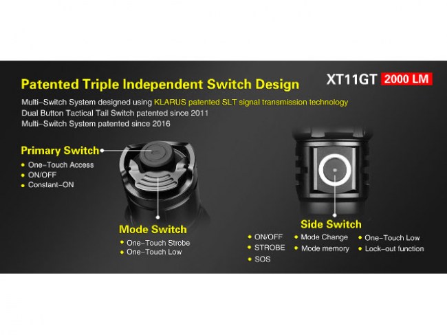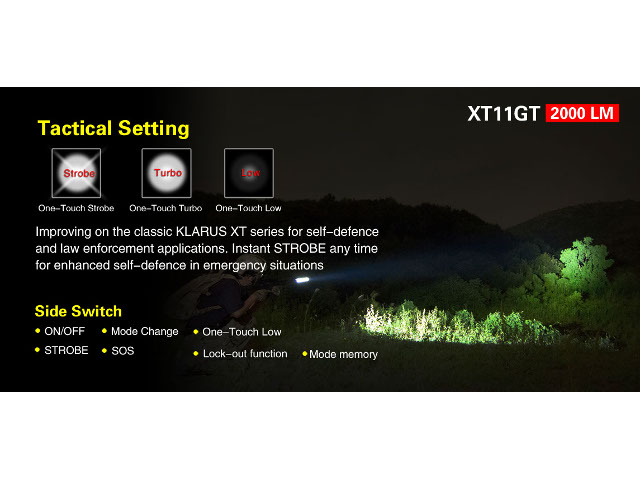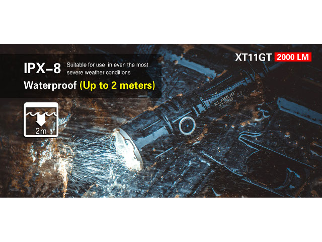 | Strobo 2000lm/1,7h, SOS 100lm/36h | |