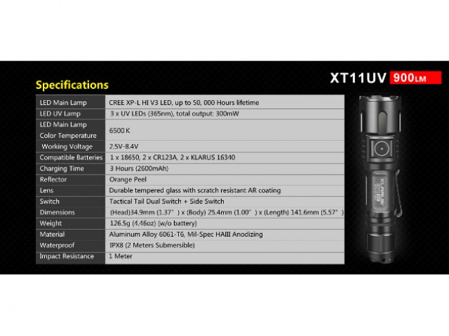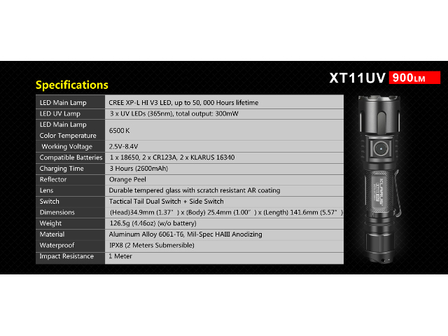 | Napajanje | 1 x 18650, 2xCR123 ili 2x Klarus 16340 |