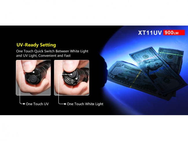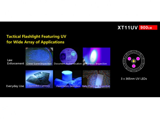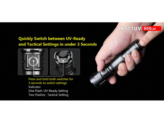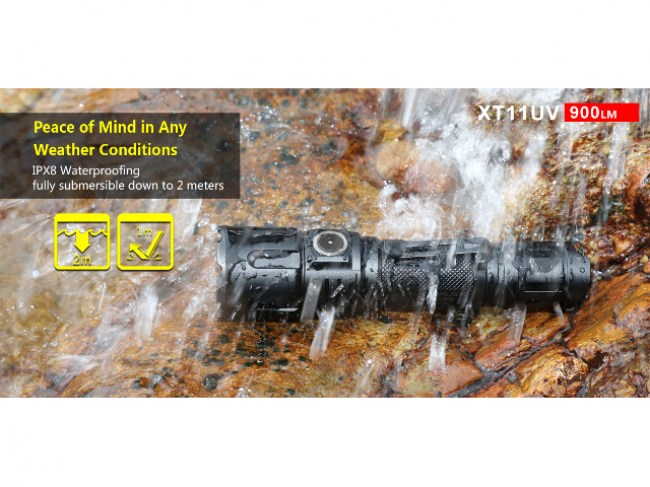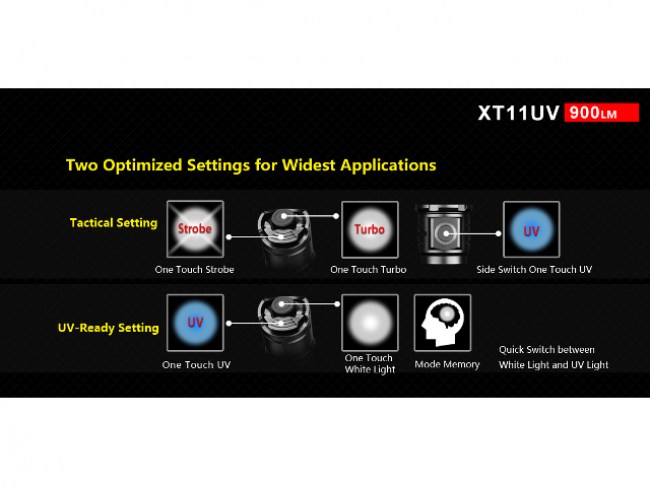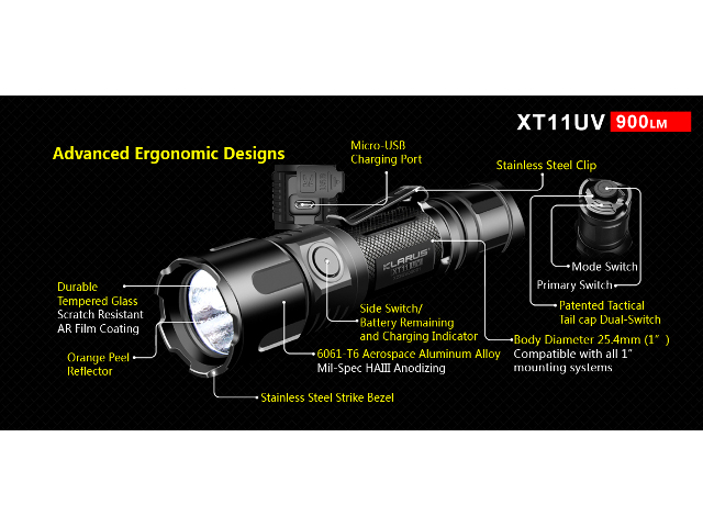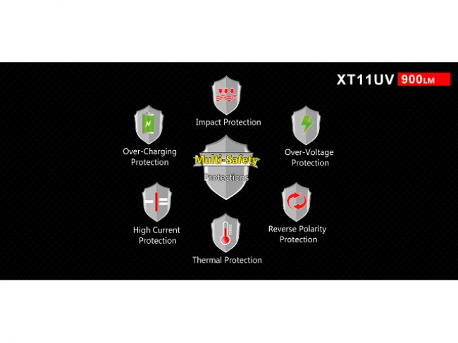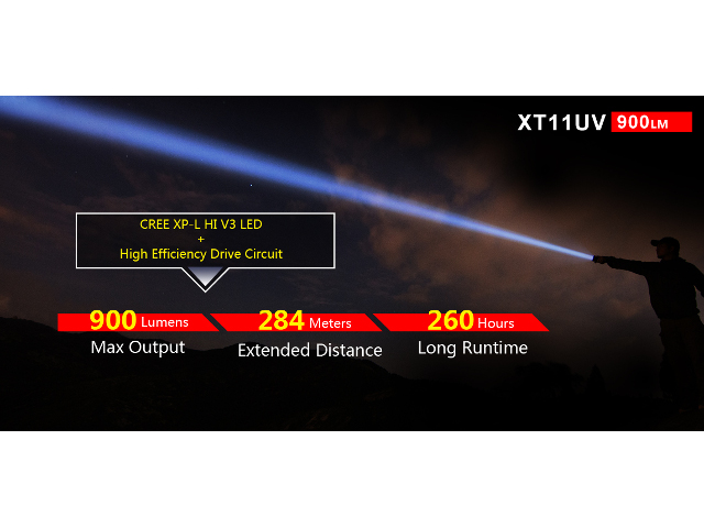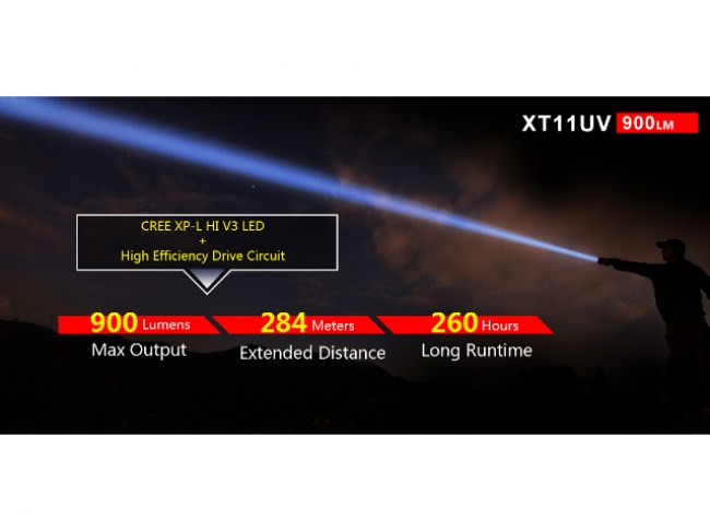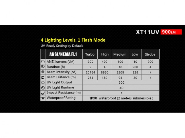 | Turbo 900lm/2h, High 400lm/4h, Medium 100lm/18h, Low 10lm/260h |